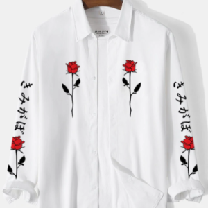 Mens Rose Japanese Print Lapel Collar Button Up Casual Shirts